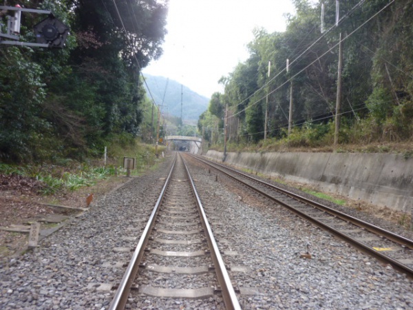 その奥へ進んで線路が!!線路の向こうに見えるのがトロッコ嵐山駅
